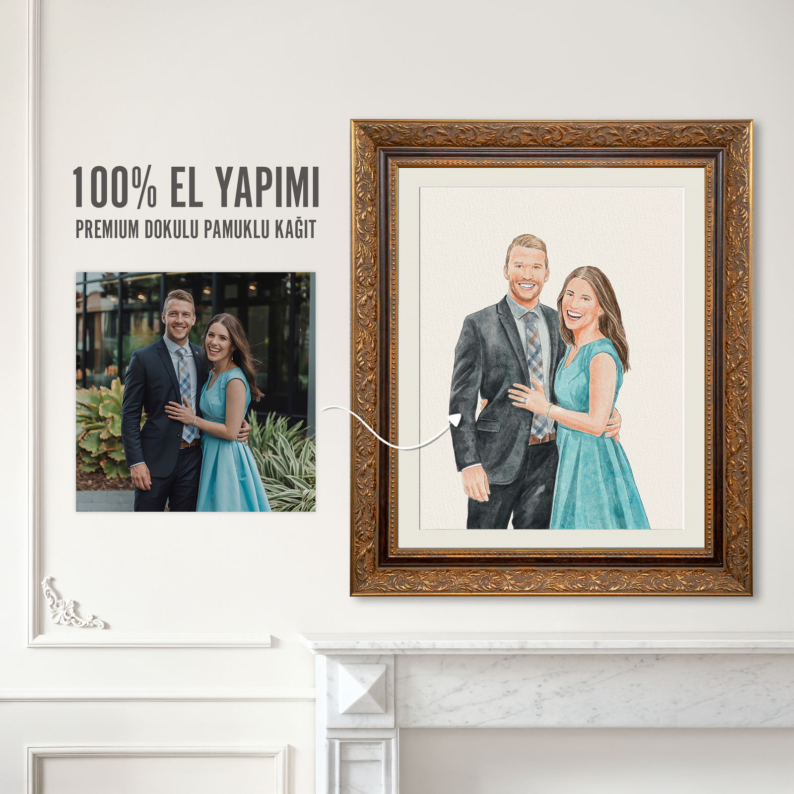 Altın Varaklı Çerçevede Kişiye Özel Suluboya Tablo